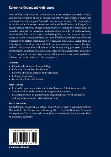 Evelyn Stommel investigates a crucial question within behavioral economics, namely the research on reference points within human decision making processes. Based on experimental investigations, she focuses three key challenges: what constitutes a reference point, the process of the formation of a reference point, and factors influencing the formation of reference points.