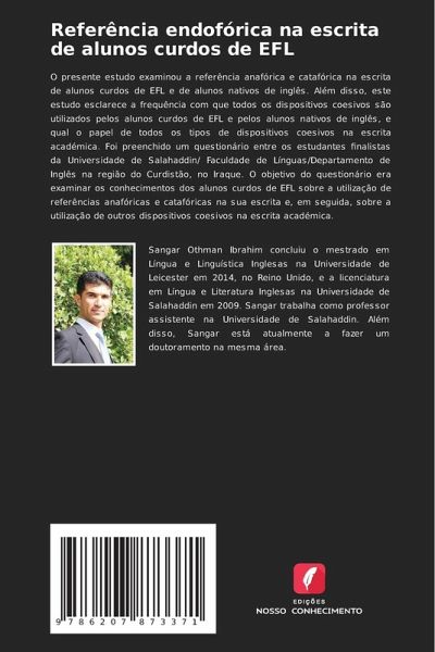 O presente estudo examinou a referência anafórica e catafórica na escrita de alunos curdos de EFL e de alunos nativos de inglês. Além disso, este estudo esclarece a frequência com que todos os dispositivos coesivos são utilizados pelos alunos curdos de EFL e pelos alunos nativos de inglês, e qual o papel de todos os tipos de dispositivos coesivos na escrita académica. Foi preenchido um questionário entre os estudantes finalistas da Universidade de Salahaddin/ Faculdade de Línguas/Departamento de Inglês na região do Curdistão, no Iraque. O objetivo do questionário era examinar os conhecimentos dos alunos curdos de EFL sobre a utilização de referências anafóricas e catafóricas na sua escrita e, em seguida, sobre a utilização de outros dispositivos coesivos na escrita académica.