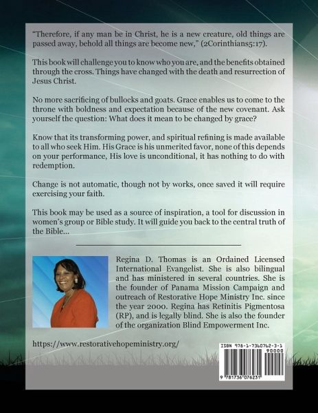 "Therefore, if any man be in Christ he is a new creature, old things are passed away, behold all things are become new," (2Corinthians5:17). This book will challenge you to know who you are and the benefits obtained through the cross. Things have changed with the death and resurrection of Jesus Christ. No more sacrificing of bullocks and goats. Grace enables us to come to the throne with boldness and expectation because of the new covenant. Ask yourself the question: What does it mean to be changed by grace? Know that its transforming power, and spiritual refining is made available to all who seek Him. His Grace is his unmerited favor, none of this depends on your performance, His love is unconditional, it has nothing to do with redemption. ¿Change is not automatic, though not by works, once saved it will require exercising your faith. This book may be used as a source of inspiration, a tool for discussion in women's group or Bible study. It will guide you back to the central truth of the Bible....