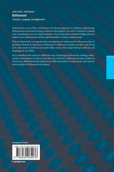 This book provides a comprehensive introduction to refinement for the researcher or graduate student. It introduces refinement in different semantic models, and shows how refinement is defined and used within some of the major formal methods and languages in use today.