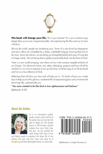 This book will change your life. This is your moment! This is your invitation to go deeper than you've ever imagined possible, into experiencing the bliss and joy of union with Jesus. There is a new world emerging, one where we live in the constant, tangible embrace of our Creator. Our desires for home, rest, safety, belonging, purpose and love will all be satisfied. It is our time to respond, to rise up and shine, to let the song of our life be heard and live as a true reflection of God. 'Reflecting God' will show you how and will take you in. This book will give you simple keys to help you live this glorious, awakened life of experiencing Jesus every moment and becoming fully, supernaturally you. "...all that Jesus now is, so are we in this world" 1 John 4:17 (TPT) Reviews "Liz Wright is one of the most captivating and clear prophetic voices of our generation. Her words flow with poetic purity and eloquence, inviting the reader into a reality of sweetness and oneness with the Divine. Every sentence carries weight and depth, breaking open the heart to experience torrents of unconditional Love." - Justin Abraham, Company of Burning Hearts "It's time to be awakened to who you REALLY are! Liz Wright has written a beautiful, identity-activation devotional for anyone who is ready for a revelatory recalibration. Read this book and expect an encounter with the love of God that ignites a fresh passion to engage Heaven and transform Earth." - Pastor Darren Stott, Seattle Revival Center