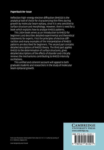 Reflection high-energy electron diffraction (RHEED) is the analytical tool of choice for characterizing thin films during growth by molecular beam epitaxy, since it is very sensitive to surface structure and morphology. This book serves as an introduction to RHEED for beginners and describes detailed experimental and theoretical treatments for experts, explaining how to analyze RHEED patterns. For beginners the principles of electron diffraction are explained and many examples of the interpretation of RHEED patterns are described. The second part of the book contains detailed descriptions of RHEED theory. The third part applies RHEED to the determination of surface structures, gives detailed descriptions of the effects of disorder, and critically reviews the mechanisms contributing to RHEED intensity oscillations. This unified and coherent account will appeal to both graduate students and researchers in the study of molecular beam epitaxial growth.