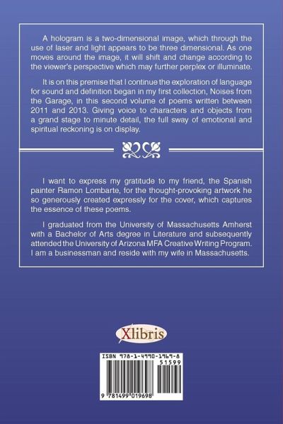 A hologram is a two-dimensional image, which through the use of laser and light appears to be three dimensional. As one moves around the image, it will shift and change according to the viewer's perspective which may further perplex or illuminate. It is on this premise that I continue the exploration of language for sound and definition began in my first collection, Noises from the Garage, in this second volume of poems written between 2011 and 2013. Giving voice to characters and objects from a grand stage to minute detail, the full sway of emotional and spiritual reckoning is on display.