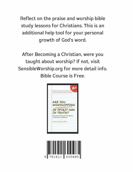 Christian Worship Notebook to use for your personal praise and worship bible study lessons from "Are You Worshipping In Spirit and In Truth by Shelena Griffiths." Get an understanding of the topic of praise and worship from the Holy Bible. It is an excellent subject to learn about, and is often misunderstood and not done properly. I give you an opportunity for free to learn online at SensibleWorship.org with this purchase.