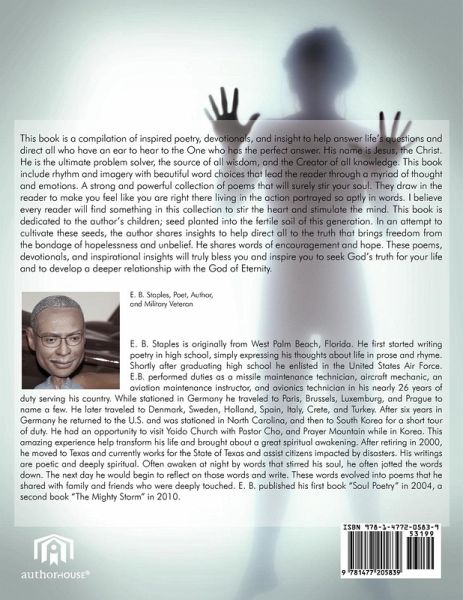 This book is a compilation of inspired poetry, devotionals, and insight to help answer life's questions and direct all who have an ear to hear to the One who has the perfect answer. His name is Jesus, the Christ. He is the ultimate problem solver, the source of all wisdom, and the Creator of all knowledge. This book include rhythm and imagery with beautiful word choices that lead the reader through a myriad of thought and emotions. A strong and powerful collection of poems that will surely stir your soul. They draw in the reader to make you feel like you are right there living in the action portrayed so aptly in words. I believe every reader will find something in this collection to stir the heart and stimulate the mind. This book is dedicated to the author's children; seed planted into the fertile soil of this generation. In an attempt to cultivate these seeds, the author shares insights to help direct all to the truth that brings freedom from the bondage of hopelessness and unbelief. He shares words of encouragement and hope. These poems, devotionals, and inspirational insights will truly bless you and inspire you to seek God's truth for your life and to develop a deeper relationship with the God of Eternity.