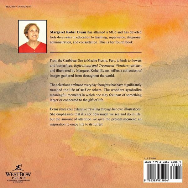 From the Caribbean Sea to Machu Picchu, Peru, to birds to flowers and butterflies, Reflections and Treasured Wonders, written and illustrated by Margaret Kohel Evans, offers a collection of images gathered from throughout the world. The selections embrace everyday thoughts that have significantly touched the life of self or others. The wonders symbolize meaningful moments in which one may feel part of something larger or connected to the gift of life. Evans shares her extensive traveling through her own illustrations. She emphasizes that it's not how much we see and do in life, but the amount of attention we give the present moment: an inspiration to enjoy life to its fullest.