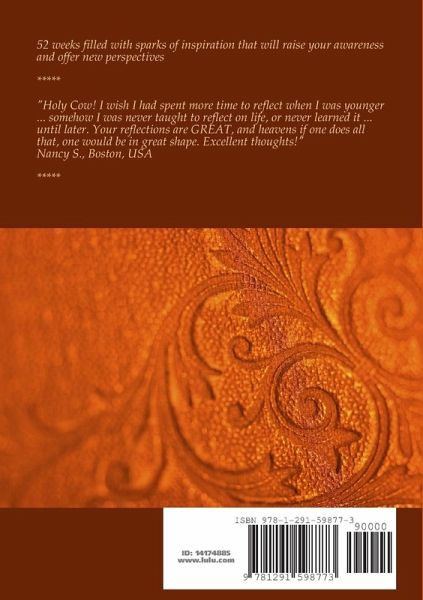 Short paragraphes, one for each week of the year. 52 weeks filled with sparks of inspiration that will raise your awareness and offer new perspectives. Great for men and women who wish to live a life with more depth and understanding. A wonderful gift for loved ones. Topics of all areas of your life. A bedside book with space for your own notes.