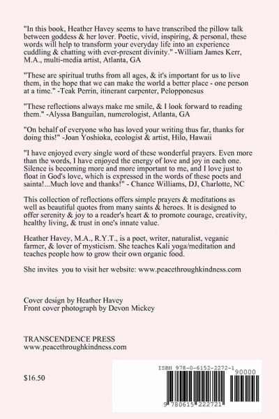 This collection of reflections offers simple prayers and meditations as well as beautiful quotes from many saints and heroes. It is designed to offer serenity and joy to a reader's heart and to promote courage, creativity, healthy living, and trust in one's innate value. Heather Havey is a naturalist, park ranger, veganic farmer, & teacher of many forms of yoga & meditation. She lives in an interfaith spiritual community that is devoted to loving-kindness & service.