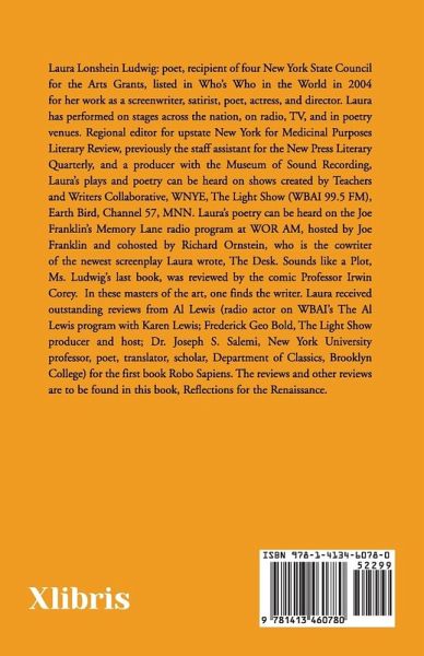 Laura Lonshein Ludwig: poet, recipient of four New York State Council for the Arts Grants, listed in Who's Who in the World in 2004 for her work as a screenwriter, satirist, poet, actress, and director. Laura has performed on stages across the nation, on radio, TV, and in poetry venues. Regional editor for upstate New York for Medicinal Purposes Literary Review, previously the staff assistant for the New Press Literary Quarterly, and a producer with the Museum of Sound Recording, Laura's plays and poetry can be heard on shows created by Teachers and Writers Collaborative, WNYE, The Light Show (WBAI 99.5 FM), Earth Bird, Channel 57, MNN. Laura's poetry can be heard on the Joe Franklin's Memory Lane radio program at WOR AM, hosted by Joe Franklin and cohosted by Richard Ornstein, who is the cowriter of the newest screenplay Laura wrote, The Desk. Sounds like a Plot, Ms. Ludwig's last book, was reviewed by the comic Professor Irwin Corey. In these masters of the art, one finds the writer. Laura received outstanding reviews from Al Lewis (radio actor on WBAI's The Al Lewis program with Karen Lewis; Frederick Geo Bold, The Light Show producer and host; Dr. Joseph S. Salemi, New York University professor, poet, translator, scholar, Department of Classics, Brooklyn College) for the first book Robo Sapiens. The reviews and other reviews are to be found in this book, Reflections for the Renaissance. Ms. Ludwig's work can be found in the Mid-Manhattan Library, NYU Bobst Library, the Brooklyn Library, and published in over sixty literary publications. The Xlibris website and all major websites, such as the Barnes and Noble (through Xlibris by e-mail and phone), the St. Mark's Bookshop, and City Lights Booksellers in San Francisco, California. Available worldwide; Amazon.com and Barnes and Noble bookstores can order it for you with other books and chapbooks by Laura Lonshein Ludwig. Reflections for the Renaissance is a book of poetry on the masters in literature, theatre, and the screen, for art is life, and life can only be art by loving art itself. The delight and experience in reading the masters in literature and studying the great writers, comics, producers, and artists throughout the ages that have moved Ms. Ludwig to the pen and to the screen. Also included in this collection is The Man on the Street Is without a Prayer, the screenplay that Richard Ornstein compared to Duck Soup, the genius of the Marx Brothers, and Ms. Ludwig's work to Mel Brooks. Short comic plays are included as well. Ms. Ludwig studied acting at the Gene Frankel Theatre, attended Franconia College, and worked in sales and customer relations for twenty years. In a desire to produce television that educates and provides the community with the arts, Ms. Ludwig offered ballet, opera, theatre, poetry, plays, and films to present her screenplays and the work of other artists and activists for ten years in pursuit of program time offering a budget. Brooklyn cable-access TV offered the public and Ms. Ludwig an opportunity to enjoy television made through concern and a love of art. Creating the show with attention to the value of language and art, it was a top-rated program combining the rising artists of New York-the new artists that have studied their craft with the stars. Ms. Ludwig presented some of the great stars in film, radio, and TV. The American dream is to enjoy good literature, and film, to reach for the fruits of your labor in the quest to be part of the renaissance in art. In that quest is the art of today and those that influence and encourage the creation of art. Reflections for the Renaissance honors the artists that I have worked with and who inspired many other artists in the New York poetry circuit, while creating a new body of art to be treasured and to help shape the new renaissance in art for the twenty-first century.