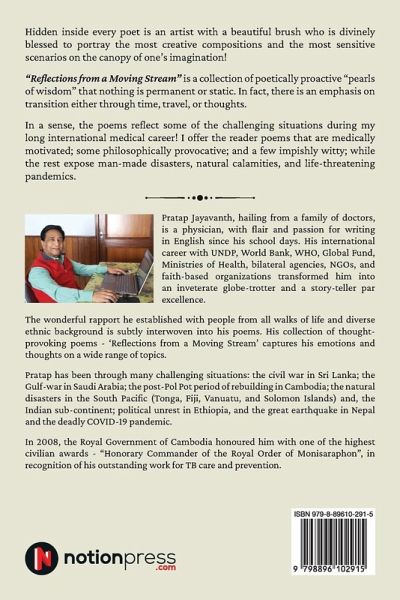 Hidden inside every poet is an artist with a beautiful brush who is divinely blessed to portray the most creative compositions and the most sensitive scenarios on the canopy of one's imagination! "Reflections from a Moving Stream" is a collection of poetically proactive "pearls of wisdom" that nothing is permanent or static. In fact, there is an emphasis on transition either through time, travel, or thoughts. In a sense, the poems refl ect some of the challenging situations during my long international medical career! I offer the reader poems that are medically motivated; some philosophically provocative; and a few impishly witty; while the rest expose man-made disasters, natural calamities, and life-threatening pandemics.