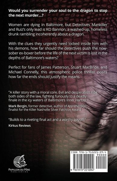Would you give up your soul to the dragon to stop the next murder...? KO Bannon thinks he saw something bad, very bad that New Year's Eve on the shimmering waters of the Baltimore Harbor. Homeless, adrift, and cold, KO is paralyzed with fear, certain that if he tells, the dragon he saw will surely catch him and end him. Women are dying in Baltimore. A particular kind of young, blonde, innocent victim. And Detectives Mankiller and Ruiz's only lead is a washed-up, drunk ex-boxer who once went toe-to-toe with Sugar Ray Leonard. A man now talking about a dragon. How can they probe and interpret the memories of a drunkard? How far can they-should they-push the old man to find out what he thinks he saw while in the cocoon of a bottle? Marty Hightower knows what they say about keeping your enemies close. Afraid of what the street bum might have seen that night under the firework-lit sky, he recruits him into his company's new rehabilitation program. KO Bannon might have been clever in the ring back in the day, but he will surely be susceptible and let slip what Marty needs to know to control him. Like the estranged daughter and grandson, who will provide the perfect safety net to stop Bannon from helping the police. Marty will stay hidden, safe in the shadows, before he lures the next woman to him and experiences the ultimate high of watching the light of life leave her eyes... The paths of the witness, the cops, and the murderer will inevitably collide if what is right stands in the way of saving the next life. Set in the streets and around the waters of Baltimore and perfect for fans of James Patterson, Stuart MacBride, and Michael Connelly, this atmospheric police thriller posits how far the ends should justify the means. "The alleged dragon is the grandest mystery...Readers get a frighteningly careful murderer." - Kirkus Reviews