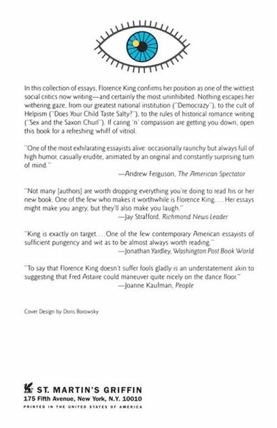 In this collection of essays, Florence King confirms her position as one of the wittiest social critics now writing-and certainly the most uninhibited. Nothing escapes her withering gaze, from our greatest national institution ("Democrazy"), to the cult of Helpism ("Does Your Child Taste Salty?"), to the rules of historical romance writing ("Sex and the Saxon Churl"). If caring 'n' compassion are getting you down, open this book for a refreshing whiff of vitriol.
