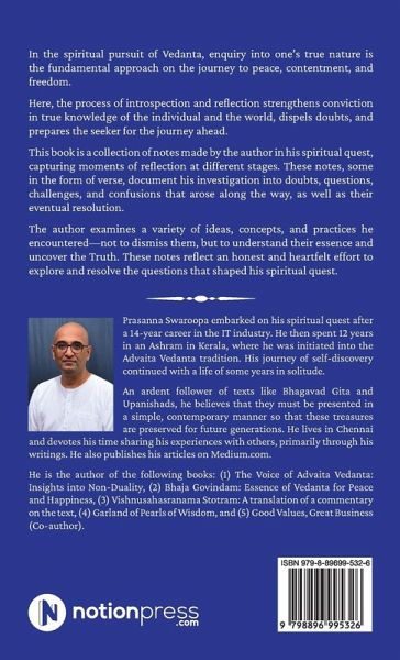 In the spiritual pursuit of Vedanta, enquiry into one's true nature is the fundamental approach on the journey to peace, contentment, and freedom. Here, the process of introspection and reflection strengthens conviction in true knowledge of the individual and the world, dispels doubts, and prepares the seeker for the journey ahead. This book is a collection of notes made by the author in his spiritual quest, capturing moments of reflection at different stages. These notes, some in the form of verse, document his investigation into doubts, questions, challenges, and confusions that arose along the way, as well as their eventual resolution. The author examines a variety of ideas, concepts, and practices he encountered-not to dismiss them, but to understand their essence and uncover the Truth. These notes reflect an honest and heartfelt effort to explore and resolve the questions that shaped his spiritual quest.