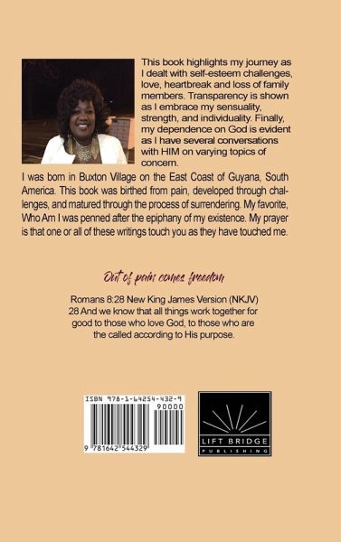 This book highlights my journey as I dealt with self-esteem challenges, love, heartbreak and loss of family members. Transparency is shown as I embrace my sensuality, strength, and individuality. Finally, my dependence on God is evident as I have several conversations with HIM on varying topics of concern. I was born in Buxton Village on the East Coast of Guyana, South America. This book was birthed from pain, developed through challenges, and matured through the process of surrendering. My favorite, "Who Am I" was penned after the epiphany of my existence. My prayer is that one or all of these writings touch you as they have touched me.