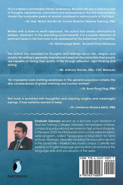 This is indeed a remarkable literary endeavor. Readers who see a kaleidoscope of thoughts, experiences, convictions, and philosophies in this book will certainly find and cherish the invaluable pearls of wisdom scattered in various parts of the book. I am impressed with the particular mention of climate change and global warming. It is indeed a timely measure to bring awareness in the general populace, especially the indifferent lot who are still in a daze over the haze prevalent in the atmosphere. Today, natural calamities have become a global crisis that warrants urgent remedies, hence, the need for clean energy revolution to combat the devastating climate bomb. Written with a down-to-earth approach, the author has seriously attempted to also awaken and enlighten dreamers to the imminent social hazards that considerably affect the harmony between the human races. Human life cannot be compromised. The despicable violent minority is comfortably riding on the docile silent majority. In the words of Abraham Lincoln, Its time we reverse might is right to right is might. Dedicate your time and energy for a cause worthy of your blessed birth on this earth. This book, enriched with thoughtful and inspiring sayings, will absolutely earn its keep. S. Applasamy, Retired Educator