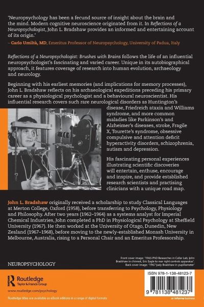 Reflections of a Neuropsychologist: Brushes with Brains follows the life of an influential neuropsychologist's fascinating and varied career. Unique in its autobiographical approach, it features coverage of research into human evolution, archaeology and neurology. Beginning with his earliest memories (and implications for memory processes), John L. Bradshaw reflects on his archaeological expeditions preceding his primary career as a physiological psychologist and a behavioural neuroscientist. His influential research covers such rare neurological disorders as Huntington's disease, Friedreich ataxia and Williams syndrome, and more common maladies like Parkinson's and Alzheimer's diseases, stroke, Fragile X, Tourette's syndrome, obsessive compulsive and attention deficit hyperactivity disorders, schizophrenia, autism and depression. His fascinating personal experiences illustrating scientific discoveries will entertain, enthuse, encourage and inspire, and provide established research scientists and practising clinicians with a unique road map.