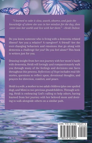 Drawing insight from her own journey with her mom's battle with dementia, Heidi will lovingly and compassionately walk you through many of the feelings and decisions one faces throughout this process. Reflections of Hope includes real-life stories, questions to reflect upon, devotional thoughts, and prayers for direction, comfort and peace.