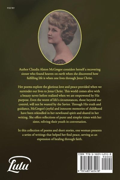Author Claudia Alston McGregor considers herself a recovering sinner who found heaven on earth when she discovered how fulfilling life is when one lives through Jesus Christ. Her poems explore the glorious love and peace provided when we surrender our lives to Jesus Christ. This world comes alive with a beauty never before realized when we are empowered by His purpose. Even the worst of life's circumstances, those beyond our control, will not be wasted by the Savior. Through His truth and guidance, McGregor's joyful and innocent memories of childhood have been rekindled in her newfound spirit and shared in her writing. She offers reflections of purer and simpler times with her sister, reliving their youth in conversation. In this collection of poems and short stories, one woman presents a series of writings that helped her find peace, serving as an expression of healing through faith.