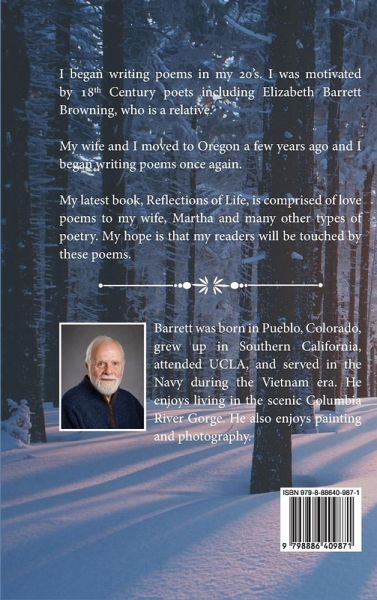 I began writing poems in my 20's. I was motivated by 18th Century poets including Elizabeth Barrett Browning, who is a relative. My wife and I moved to Oregon a few years ago and I began writing poems once again. My latest book, Reflections of Life, is comprised of love poems to my wife, Martha and many other types of poetry. My hope is that my readers will be touched by these poems.