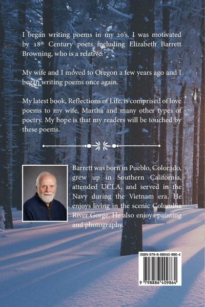I began writing poems in my 20's. I was motivated by 18th Century poets including Elizabeth Barrett Browning, who is a relative. My wife and I moved to Oregon a few years ago and I began writing poems once again. My latest book, Reflections of Life, is comprised of love poems to my wife, Martha and many other types of poetry. My hope is that my readers will be touched by these poems.