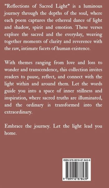 *Reflections of Sacred Light" is a luminous Journey through the depths of the soul, where each poem captures the ethereal dance of light and shadow, spirit and emotion. These verses explore the sacred and the everyday, weaving together moments of clarity and reverence with the raw, intimate facets of human existence. With themes ranging from love and loss to wonder and transcendence, this collection invites readers to pause, reflect, and connect with the light within and around them. Let the words guide you into a space of inner stillness and inspiration, where sacred truths are illuminated, and the ordinary is transformed into the ue LOCC TMA Embrace the journey. Let the light lead you home.