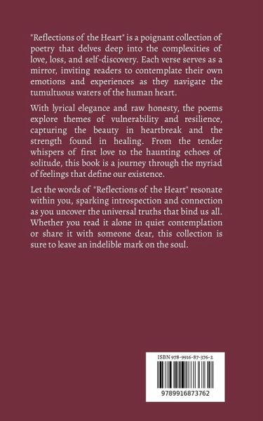 "Reflections of the Heart" is a poignant collection of poetry that delves deep into the complexities of love, loss, and self-discovery. Each verse serves as a mirror, inviting readers to contemplate their own emotions and experiences as they navigate the tumultuous waters of the human heart. With lyrical elegance and raw honesty, the poems explore themes of vulnerability and resilience, capturing the beauty in heartbreak and the strength found in healing. From the tender whispers of first love to the haunting echoes of solitude, this book is a journey through the myriad of feelings that define our existence. Let the words of "Reflections of the Heart" resonate within you, sparking introspection and connection as you uncover the universal truths that bind us all. Whether you read it alone in quiet contemplation or share it with someone dear, this collection is sure to leave an indelible mark on the soul.