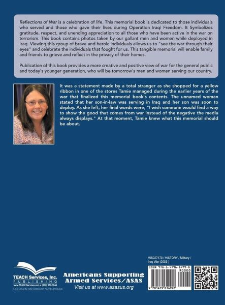 It was a statement made by a total stranger as she shopped for a yellow ribbon in one of the stores Tamie managed during the earlier years of the war that finalized this memorial book's contents. The unnamed woman stated that her son-in-law was serving in Iraq and her son was soon to deploy. As she left, her final words were, "I wish someone would find a way to show the good that comes from war instead of the negative the media always displays." At that moment, Tamie knew what this memorial should be about. Reflections of War is a celebration of life. This memorial book is dedicated to those individuals who served and those who gave their lives during Operation Iraqi Freedom. It Symbolizes gratitude, respect, and unending appreciation to all those who have been active in the war on terrorism. This book contains photos taken by our gallant men and women while deployed in Iraq. Viewing this group of brave and heroic individuals allows us to "see the war through their eyes" and celebrate the individuals that fought for us. This tangible memorial will enable family and friends to grieve and reflect in the privacy of their homes. Publication of this book provides a more creative and positive view of war for the general public and today's younger generation, who will be tomorrow's men and women serving our country.