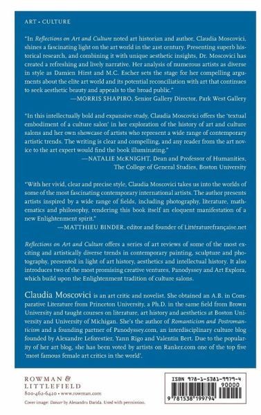 Reflections on Art and Culture: From Diderot's Salons to Panodyssey and Art Explora offers a series of art reviews of some of the most exciting and artistically diverse trends in contemporary painting, sculpture and photography, presented in light of art history, aesthetics and intellectual history. It also introduces two of the most promising cultural ventures that build upon the Enlightenment tradition of the salons: Panodyssey (founded by French entrepreneur and music executive Alexandre Leforestier) and Art Explora (founded by two of the leaders of Paris's top museums, Frédéric Jousset and Bruno Julliard). In emphasizing a wide range of styles of art, this book also covers a critical blind spot, by including contemporary artists influenced by Realism and Romanticism, who are extremely popular with galleries, buyers and the general public but tend not to get the attention they deserve from art critics and museums of contemporary art. At the same time, in the spirit of promoting artistic pluralism, Reflections on Art and Culture also presents much-discussed trends, such as Damien Hirst's neoconceptual art, as well as some of the most popular artistic photographers in the world, who successfully straddle the domains of marketing and art.