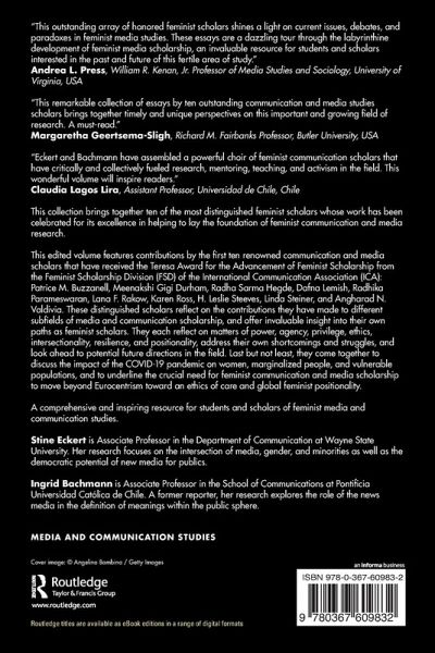This edited volume features contributions by the first ten renowned communication and media scholars that have received the Teresa Award for the Advancement of Feminist Scholarship from the Feminist Scholarship Division (FSD) of the International Communication Association (ICA): Patrice M. Buzzanell, Meenakshi Gigi Durham, Radha Sarma Hegde, Dafna Lemish, Radhika Parameswaran, Lana F. Rakow, Karen Ross, H. Leslie Steeves, Linda Steiner, and Angharad N. Valdivia. These distinguished scholars reflect on the contributions they have made to different subfields of media and communication scholarship, and offer invaluable insight into their own paths as feminist scholars. They each reflect on matters of power, agency, privilege, ethics, intersectionality, resilience, and positionality, address their own shortcomings and struggles, and look ahead to potential future directions in the field. Last but not least, they come together to discuss the impact of the COVID-19 pandemic on women, marginalized people, and vulnerable populations, and to underline the crucial need for feminist communication and media scholarship to move beyond Eurocentrism toward an ethics of care and global feminist positionality.