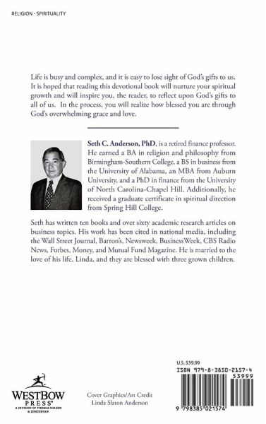 Life is busy and complex, and it is easy to lose sight of God's gifts to us. It is hoped that reading this devotional book will nurture your spiritual growth and will inspire you, the reader, to reflect upon God's gifts to all of us. In the process, you will realize how blessed you are through God's overwhelming grace and love.