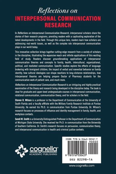 In Reflections on Interpersonal Communication Research, interpersonal scholars share the stories of their research programs, providing readers with a captivating exploration of the latest developments in the field. Through this unique lens, readers learn how scholars are addressing real-world issues, as well as the complex role interpersonal communication plays in our world today. This innovative collection brings together cutting-edge research from a variety of scholars in the discipline, illustrating the expansive reach and infinite applications of this exciting field of study. Readers discover groundbreaking applications of interpersonal communication theories and concepts to family, health, intercultural, organizational, political, and mediated communication. Specific studies explore the effects of language brokering with immigrant children, the impact of verbal and nonverbal behavior on family identity, how cultural ideologies can shape reactions to long-distance relationships, how interpersonal theories are helping prepare Doctor of Pharmacy students for the communication work of patient care, and much more. Reflections on Interpersonal Communication Research is an intriguing and highly practical examination of the theory and research being developed in the discipline today. The book is ideal for graduate and upper-level undergraduate courses in interpersonal communication, relational communication, communication theory, and for scholars in the field. Steven R. Wilson is a professor in the Department of Communication at the University of South Florida and a faculty affiliate with the Military Family Research Institute at Purdue University. He earned his Ph.D. in communication from Purdue University. Dr. Wilson's research focuses on processes of influence and identity management in family, health, and workplace contexts. Sandi W. Smith is a University Distinguished Professor in the Department of Communication at Michigan State University. She received her Ph.D. in communication from the University of Southern California. Dr. Smith's research focuses on persuasion, communication theory, and interpersonal communication in health and criminal justice contexts.