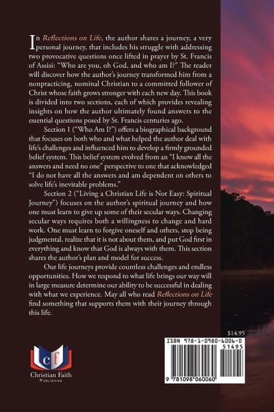 In Reflections on Life, the author shares a journey, a very personal journey, that includes his struggle with addressing two provocative questions once lifted in prayer by St. Francis of Assisi: Who are you, oh God, and who am I? The reader will discover how the authors journey transformed him from a nonpracticing, nominal Christian to a committed follower of Christ whose faith grows stronger with each new day. This book is divided into two sections, each of which provides revealing insights on how the author ultimately found answers to the essential questions posed by St. Francis centuries ago. Section 1 (Who Am I?) offers a biographical background that focuses on both who and what helped the author deal with life's challenges and influenced him to develop a firmly grounded belief system. This belief system evolved from an I know all the answers and need no one perspective to one that acknowledged I do not have all the answers and am dependent on others to solve life's inevitable problems. Section 2 (Living a Christian Life is Not Easy: Spiritual Journey) focuses on the authors spiritual journey and how one must learn to give up some of their secular ways. Changing secular ways requires both a willingness to change and hard work. One must learn to forgive oneself and others, stop being judgmental, realize that it is not about them, and put God first in everything and know that God is always with them. This section shares the authors plan and model for success. Our life journeys provide countless challenges and endless opportunities. How we respond to what life brings our way will in large measure determine our ability to be successful in dealing with what we experience. May all who read Reflections on Life find something that supports them with their journey through this life.