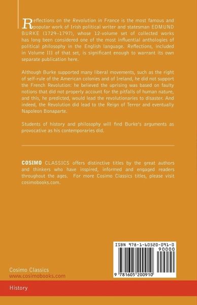 Reflections on the Revolution in France is the most famous and popular work of Irish political writer and statesman EDMUND BURKE (1729-1797), whose 12-volume set of collected works has long been considered one of the most influential anthologies of political philosophy in the English language. Reflections, included in Volume III of that set, is significant enough to warrant its own separate publication here. Although Burke supported many liberal movements, such as the right of self-rule of the American colonies and of Ireland, he did not support the French Revolution: he believed the uprising was based on faulty notions that did not properly account for the pitfalls of human nature, and this, he predicted, would lead the revolutionaries to disaster. And indeed, the Revolution did lead to the Reign of Terror and eventually Napoleon Bonaparte. Students of history and philosophy will find Burke's arguments as provocative as his contemporaries did.