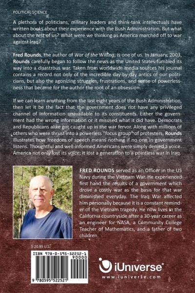A plethora of politicians, military leaders and think-tank intellectuals have written books about their experience with the Bush Administration. But what about the rest of us? What were we thinking as America marched off to war against Iraq? Fred Rounds, the author of War of the Willing, is one of us. In January, 2003, Rounds carefully began to follow the news as the United States fumbled its way into a disastrous war. Taken from worldwide media sources his journal contains a record not only of the incredible day-by-day antics of our politicians, but also the agonizing struggles, frustrations, and sense of powerlessness that became for the author the root of an obsession. If we can learn anything from the last eight years of the Bush Administration, then let it be the fact that the government does not have any privileged channel of information unavailable to its constituents. Either the government had the wrong information or it misused what it did have. Democrats and Republicans alike got caught up in the war fervor. Along with millions of others who were thrust into a powerless "focus group" of protesters,Rounds illustrates how freedom of speech means nothing if no one in government listens. Thoughtful and well-informed Americans were simply denied a voice. America not only lost its voice; it lost a generation to a pointless war in Iraq.