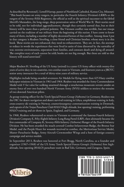 As described by Reverend J. Lowell Harrup, pastor of Northland Cathedral, Kansas City, Missouri: "This book focuses on army rangers, in particular the Fourth Infantry Division’s LRRPs or the rangers of the Seventy-Fifth Regiment, the official as well as the spiritual successor to the fabled Merrill’s Marauders, the long-range, deep-penetration units of World War II. Their stories need to be told, not for individual aggrandizement, though they certainly earned that, but so their history will be more than a political polemic. The Vietnam conflict was terrible, but our troops carried on the tradition of our military from the beginning of this nation. I have come to know many of them, including a number of highly decorated heroes of that conflict. Among those I put in that category is Reuben Siverling, a close friend and Christian brother, whose story is in this book. These stories are not enhanced; they need no enhancement. They are, in fact, the attempt to reduce in words the experiences that were lived in units of time distorted by the surreality of war, extreme environments, separation from families, and constant death and dying all around. The complete story of each cannot be told; books are not big enough. But these are told so that history will stand unrevised."