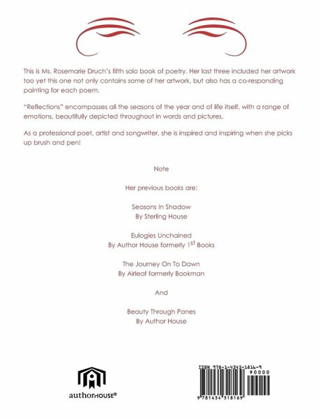 This is Ms. Rosemarie Druch's fifth solo book of poetry. Her last three included her artwork too yet this one not only contains some of her artwork, but also has a co-responding painting for each poem. "Reflections" encompasses all the seasons of the year and of life itself, with a range of emotions, beautifully depicted throughout in words and pictures. As a professional poet, artist and songwriter, she is inspired and inspiring when she picks up brush and pen! Note Her previous books are: Seasons In Shadow By Sterling House Eulogies Unchained By Author House formerly 1st Books The Journey On To Dawn By Airleaf formerly Bookman And Beauty Through Panes By Author House