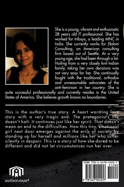 This is the author¿s true story. A heart warming love story with a very tragic end. The protagonist¿s life doesn¿t halt. It continues just like her spirit. That doesn¿t mean an end to the difficulties. How this tiny, emotional girl next door emerges against the evils of society by standing up for herself and millions like her who suffer silently in despair. This is a story of how she dared to be different and did not let circumstances run her over.