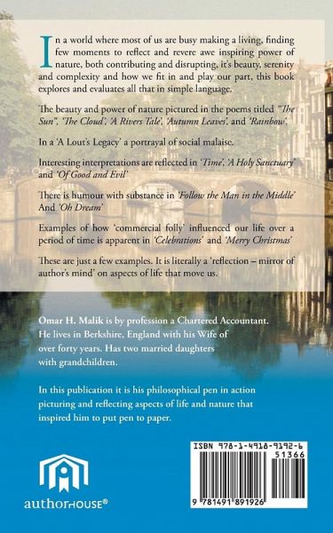 In a world where most of us are busy making a living, finding few moments to reflect and revere awe inspiring power of nature, both contributing and disrupting, it¿s beauty, serenity and complexity and how we fit in and play our part, this book explores and evaluates all that in simple language. The beauty and power of nature pictured in the poems titled ¿The Sun¿, ¿The Cloud¿, ¿A Rivers Tale¿, ¿Autumn Leaves¿, and ¿Rainbow¿. In a ¿A Lout¿s Legacy¿ a portrayal of social malaise. Interesting interpretations are reflected in ¿Time¿, ¿A Holy Sanctuary¿ and ¿Of Good and Evil¿ There is humour with substance in ¿Follow the Man in the Middle¿ And ¿Oh Dream¿ Examples of how ¿commercial folly¿ influenced our life over a period of time is apparent in ¿Celebrations¿ and ¿Merry Christmas¿ These are just a few examples. It is literally a ¿reflection ¿ mirror of author¿s mind¿ on aspects of life that move us.