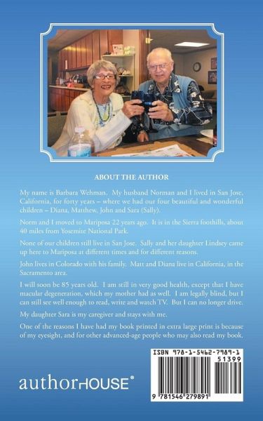 ABOUT THE AUTHOR My name is Barbara Wehman. My husband Norman and I lived in San Jose, California, for forty years - where we had our four beautiful and wonderful children - Diana, Matthew, John and Sara (Sally). Norm and I moved to Mariposa 22 years ago. It is in the Sierra foothills, about 40 miles from Yosemite National Park. None of our children still live in San Jose. Sally and her daughter Lindsey came up here to Mariposa at different times and for different reasons. John lives in Colorado with his family. Matt and Diana live in California, in the Sacramento area. I will soon be 85 years old. I am still in very good health, except that I have macular degeneration, which my mother had as well. I am legally blind, but I can still see well enough to read, write and watch TV. But I can no longer drive. My daughter Sara is my caregiver and stays with me. One of the reasons I have had my book printed in extra large print is because of my eyesight, and for other advanced-age people who may also read my book.