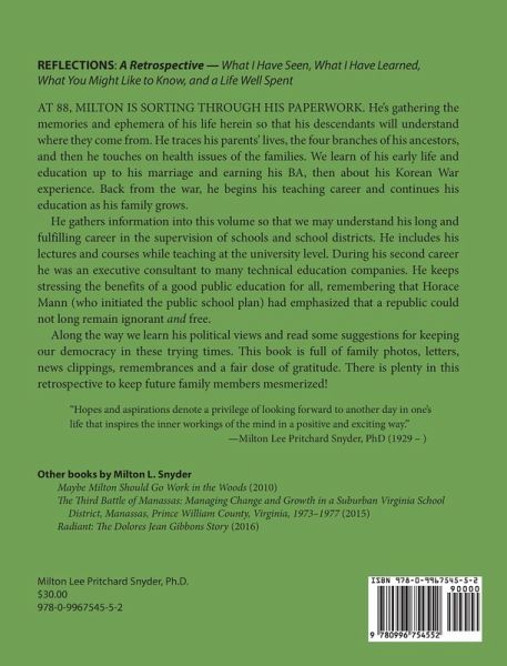 At 88, Milton is sorting through his paperwork. He's gathering the memories and ephemera of his life herein so that his descendants will understand where they come from. He traces his parents' lives, the four branches of his ancestors, and then he touches on health issues of the families. We learn of his early life and education up to his marriage and earning his BA, then about his Korean War experience. Back from the war, he begins his teaching career and continues his education as his family grows. He gathers information into this volume so that we may understand his long and fulfilling career in the supervision of schools and school districts. He includes his lectures and courses while teaching at the university level. During his second career he was an executive consultant to many technical education companies. He keeps stressing the benefits of a good public education for all, remembering that Horace Mann (who initiated the public school plan) had emphasized that a republic could not long remain ignorant and free. Along the way we learn his political views and read some suggestions for keeping our democracy in these trying times. This book is full of family photos, letters, news clippings, remembrances and a fair dose of gratitude. There is plenty in this retrospective to keep future family members mesmerized!