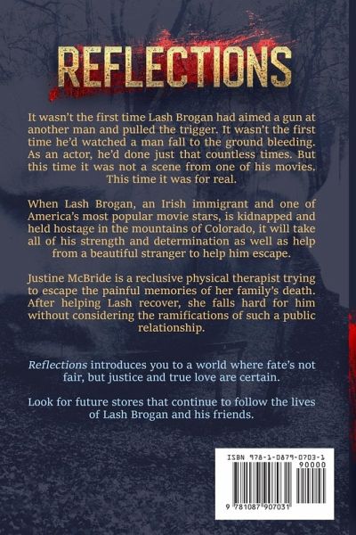 It wasn't the first time Lash Brogan had aimed a gun at another man and pulled the trigger. It wasn't the first time he'd watched a man fall to the ground bleeding. As an actor, he'd done just that countless times. But this time it was not a scene from one of his movies. This time it was for real. When Lash Brogan, an Irish immigrant and one of America's most popular movie stars, is kidnapped and held hostage in the mountains of Colorado, it will take all of his strength and determination as well as help from a beautiful stranger to help him escape. Justine McBride is a reclusive physical therapist trying to escape the painful memories of her family's death. After helping him recover, she falls hard for Lash without considering the ramifications of such a public relationship. Reflections introduces you to a world where fate's not fair, but justice and true love are certain. Look for future stories that continue to follow the lives of Lash Brogan and his friends.
