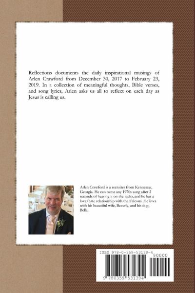 Reflections documents the daily inspirational musings of Arlen Crawford from December 30, 2017 to February 23, 2019. In a collection of meaningful thoughts, Bible verses, and song lyrics, Arlen asks us all to reflect on each day as Jesus is calling us.