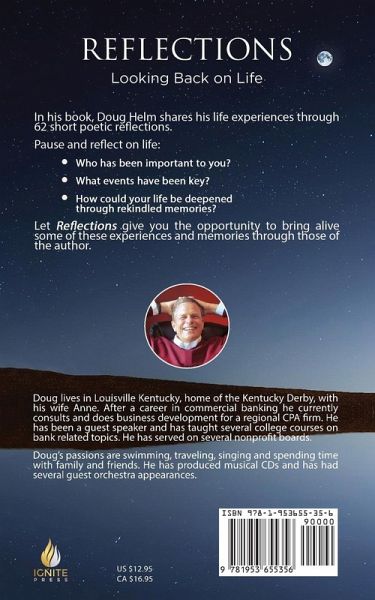 In his book, Doug Helm shares his life experiences through 62 short poetic reflections. Pause and reflect on life:Who has been important to you? What events have been key? How could your life be deepened through rekindled memories? Let Reflections give you the opportunity to bring alive some of these experiences and memories through those of the author.
