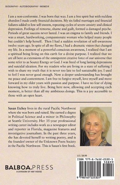 I am an impulsive non-conformist. I can't help it. I was born that way. Its in my DNA. I break the rules. There are consequences. Hell to pay. I claimed I was a free spirit but with reckless abandon I made costly financial decisions. My ego driven marriage and financial failures added to low self-esteem, repeating cycles of severe anxiety and clinical depression. My self-identity became fueled by negative self-talk over many years. But repressed feelings of remorse, unconscious shame and guilt, formed a damaged psyche. Periods of great success never lasted. I was an enigma to family and friends. A smart, hardworking, compassionate woman who helped many people couldn't help herself. Then I had a sudden revelation of self-awareness twelve years ago. I discovered my true nature. In spite of all my flaws, I had a dramatic vision that changed my life. In a moment of a powerful conscious awareness, I realized that I am a spiritual being living on this earth for a divine purpose. I realized that we are all here as extensions of the omnipotent creative force of our universe that some refer to as Source Energy or God. I was freed of long lasting depressions and suicidal ideation. For my readers who are living in a state of shame and guilt I wish to let you know it is never too late to stop the torment of your lying mind and feel sustainable joy. To know your true worth. As an adult I had noble strengths and ideals. I devoted myself to the betterment of others. Yet I punished myself by making comparisons to others. I felt I was never good enough. Overachieving was a sickness in itself. Loss of my fortunes, married six times, a rebel in my own family and community, was a path I eventually trudged alone and bereft. My familial culture and religious conditioning, and many of my lifelong beliefs betrayed me. I had to start over. This is the story of my personal journey. How a deeper understanding brought me peace and contentment. Through divine grace I became free to forgive myself, love myself and move forward in my elder years with passion and purpose. I have no fear of dying knowing how to truly live. Being here now, allowing and accepting each moment, is better than all my ambitious doings. This is a joy accessible to those with an open heart.