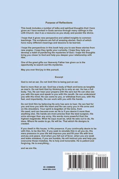 This book includes a number of talks and spiritual thoughts that I have given as I have worked in Gods service through many callings in the LDS Church. Use it as a resource as you study and ponder the divine. I hope that it gives new perspective and added insights to common teachings. The scriptures are full of amazing stories. Each of which have many different meanings and lessons to be learned. I hope the perspectives in this book help you to see these stories from new angles. I hope they ignite your curiosity. I hope they help you develop a habit of pondering the mysteries of God. I hope the thoughts bring you closer to God and help you deepen your relationship with Him. One of the great gifts our Heavenly Father has given us is the opportunity to search out His mysteries. May you ever find joy in this pursuit.