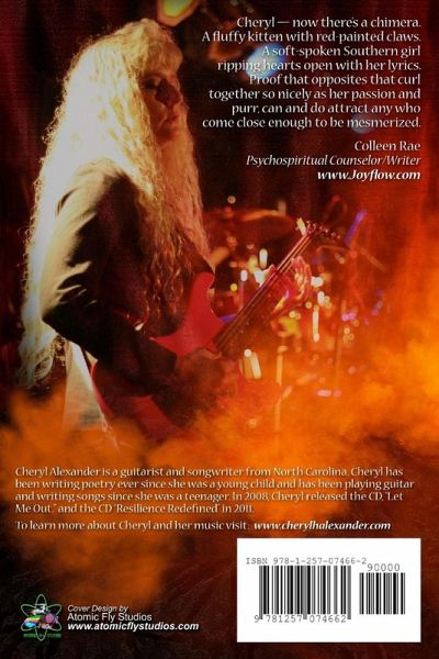 Indie musician Cheryl Alexander (www.cherylhalexander.com) selects some of her favorite lyrics and poems and provides an introspective statement about each one in this enchanting book called "Reflections." Self-revealing and heartfelt, these lyrics, poems, and introspections touch upon topics of loss, spirituality, following one's passion, sensuality and sexuality, and day-to-day challenges. The humorous piece rounds out this compilation of thought-provoking writings. Several of the songs written about in this book can be heard on Cheryl's CDs, "Let Me Out" (2008) and "Resilience Redefined" (2011).