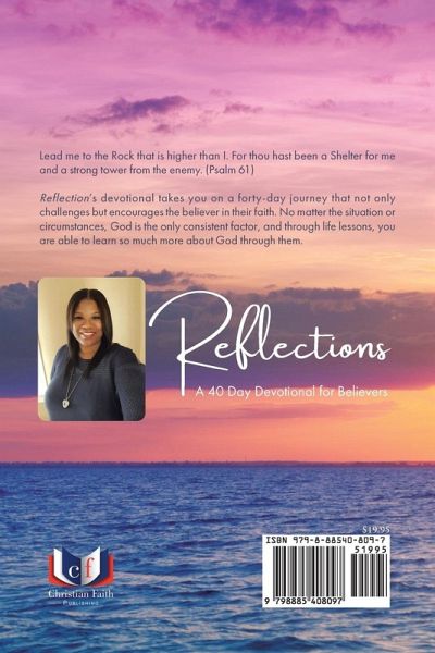 Lead me to the Rock that is higher than I. For thou hast been a Shelter for me and a strong tower from the enemy. (Psalm 61) Reflection's devotional takes you on a forty-day journey that not only challenges but encourages the believer in their faith. No matter the situation or circumstances, God is the only consistent factor, and through life lessons, you are able to learn so much more about God through them.