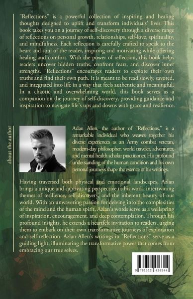 Azlan Allen, the author of "Reflections," is a remarkable individual who weaves together his diverse experiences as an Army combat veteran, modern-day philosopher, world traveler, adventurer, and mental health scholar practitioner. His profound understanding of the human condition and his own personal journeys shape the essence of his writings. Having traversed both physical and emotional landscapes, Azlan brings a unique and captivating perspective to his work, intertwining themes of resilience, self-discovery, and the inherent beauty of our world. With an unwavering passion for delving into the complexities of the mind and the human spirit, Azlan's words serve as a wellspring of inspiration, encouragement, and deep contemplation. Through his profound insights, he extends a heartfelt invitation to readers, urging them to embark on their own transformative journeys of exploration and self-reflection. Azlan Allen's writings in "Reflections" serve as a guiding light, illuminating the transformative power that comes from embracing our true selves.