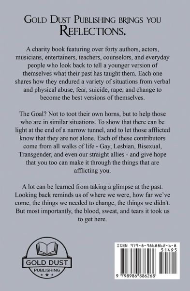 Gold Dust Publishing brings you Reflections. A charity book featuring over forty authors, actors, musicians, entertainers, teachers, counselors, and everyday people who look back to tell a younger version of themselves what their past has taught them. Each one shares how they endured a variety of situations from verbal and physical abuse, fear, suicide, rape, and change to become the best versions of themselves. The Goal? Not to toot their own horns, but to help those who are in similar situations. To show that there can be light at the end of a narrow tunnel, and to let those afflicted know that they are not alone. Each of these contributors come from all walks of life - Gay, Lesbian, Bisexual, Transgender, and even our straight allies - and give hope that you too can make it through the things that are afflicting you. A lot can be learned from taking a glimpse at the past. Looking back reminds us of where we were, how far we've come, the things we needed to change, the things we didn't. But most importantly, the blood, sweat, and tears it took us to get here.