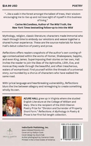 Mythology, religion, classic literature; characters made immortal who reach through time to embody our emotions and weave together a shared human experience. These are the source materials for Azure Hall's debut collection of poetry and prose. Reflections offers readers snapshots of the author's own coming-of-age contextualized within the works of Homer, Shakespeare, Sappho, and even King James. Superimposing their stories on her own, Hall invites the reader to join the likes of Aphrodite, Lilith, Eve, and more as they wade through the beautiful, and often treacherous, waters of womanhood. Find yourself within the threads of a universal story, surrounded by a chorus of characters who have walked the same road. With lyrical language and heartbreaking vulnerability, Reflections blurs the line between allegory and reimagining to create something wholly its own.